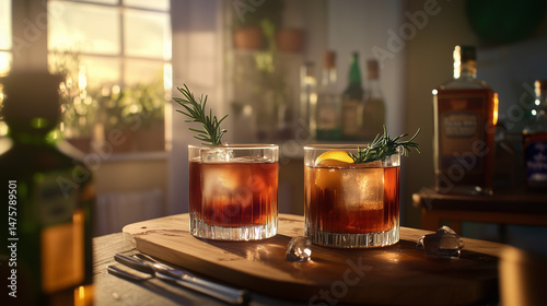 Whiskey on the Rocks with Ice and Rosemary Garnish