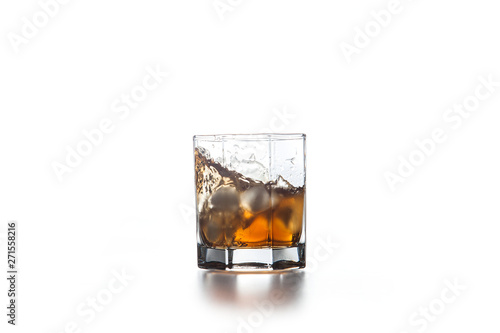 Whiskey splash from the fallen ice cube into glass with beverage on light background..