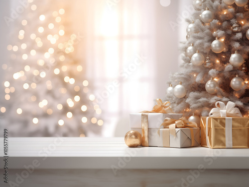 White & gold Christmas scene with presents on table, blurred bokeh lights and fairy lights