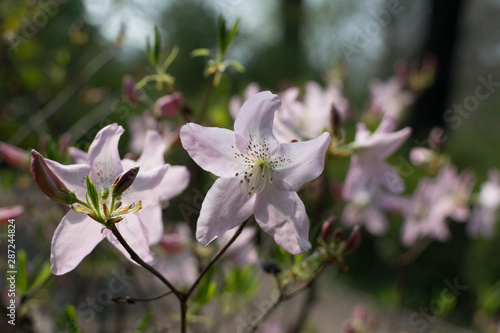 White and pink Rhododendron schlippenbachii flowers in spring garden