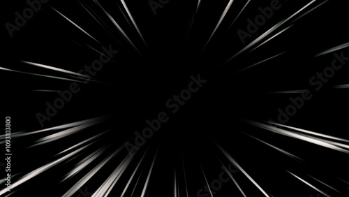 White anime speed lines on black. Anime style radial comic speed lines. Flash action, velocity lines. Comic book, manga background. Moving with the speed of light. Fast light trails.