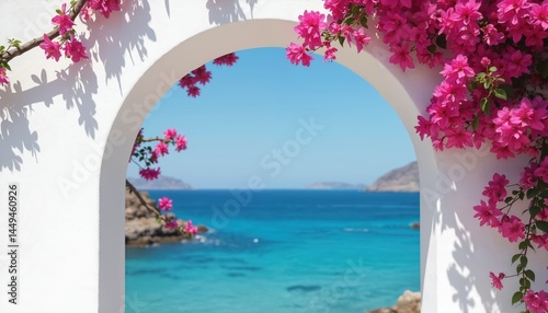 White archway frames blue ocean, pink bougainvillea flowers. Mediterranean house facade, bright sunny day, vacation mood, holiday scene, picturesque view, summer travel, scenic landscape.