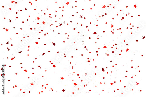 White background with red sequins. Festive backdrop for your projects. Background for your product presentation.