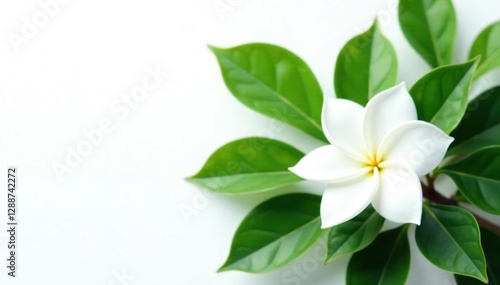 White background with separated crape jasmine leaves, gardenia, flower, blossom