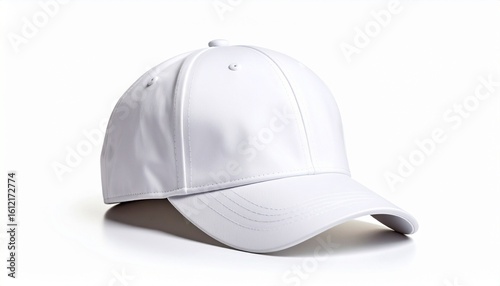 White baseball cap with curved brim and stitched panels, displayed on a smooth surface — clean silhouette and neutral tones emphasize minimalism and sporty casual style.