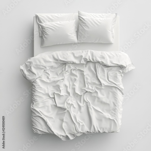 White bedding, studio shot, rumpled duvet, pillows, clean background, website mockup