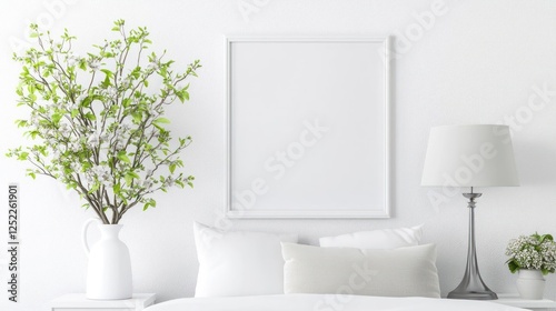 frame, bedchamber, interior, white, decor, modern, minimal, clean, simple, elegant, home, design, style, spring, leaf, plant, vase, pillow, bed, table, lamp, light, texture, wall, background, room, bright, airy, calm, serene, peaceful, soft, cosy, comfortable, relaxed, aesthetic, photo, image, template, blank, empty, neutral, pastel, vignette, still life, art