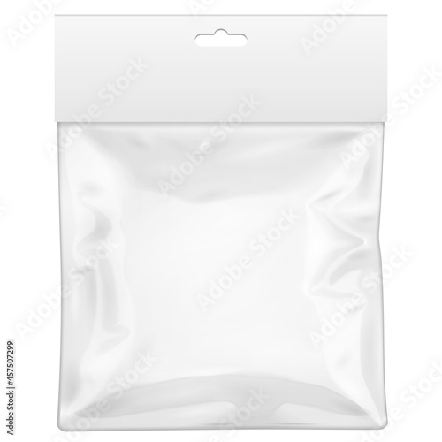 White Blank Plastic Pocket Bag With Shadow. Transparent. With Hang Slot. Illustration Isolated On White Background. Mock Up Template Ready For Your Design. Vector EPS10