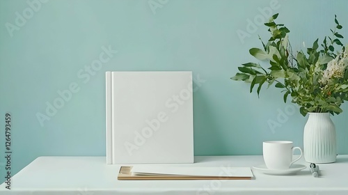 White Book Mockup on Pastel Blue Desk with Flowers
