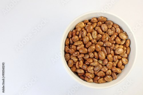 pinto, bean, bowl, food, white, background, healthy, eating, diet, nourishment, ingredient, legume, protein, fiber, vegetarian, vegan, raw, uncooked, organic, natural, fresh, agriculture, harvest, seed, brown, speckled, close, up, overhead, top, view, full, frame, copy, space, minimalism, simple, isolated, nobody, studio, shot, lifestyle, cooking, culinary, family, fabaceae, phaseolus, common