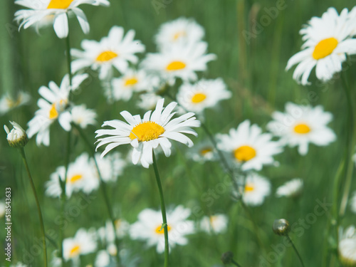 White bright chamomile flowers against the background of a summer landscape. Wildflowers outdoors closeup
