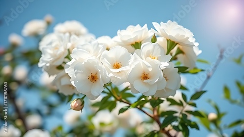 White bush roses against a blue sky, bright sunlight highlighting the flowers with gentle bokeh.