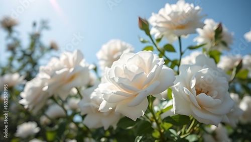 White bush roses blooming under a clear blue sky, bathed in warm sunlight with soft focus background.