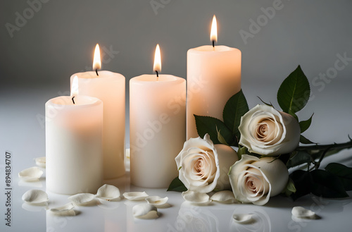White candles with roses and flowers petals, funeral memorial, sympathy and condolences card, death notice. White roses, funeral flower.