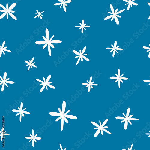 White cartoonish stars and blue sky. Vector seamless wallpaper.