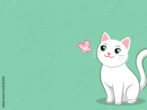 white, cat, butterfly, cartoon, playful, interaction, cheerful, animal, nature, fun, pet, cute, character, whimsical, green, background, sitting, felino, soft, illustration, adorable, creature, colourful, joy, innocence, movement, happiness, blithe, design, art, exploration, wildlife, graphic, animation, fantasy, companionship, creative, charme, captivating, scene, play, joyfulness, simple, element, serenity, calmness, delight, friends