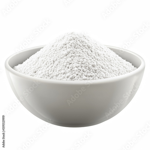 White ceramic bowl filled with finely textured white flour isolated on transparent background.