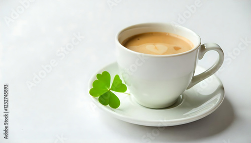 White Ceramic Cup and Saucer with Green Clover Leaf - Minimalist Tea Set
