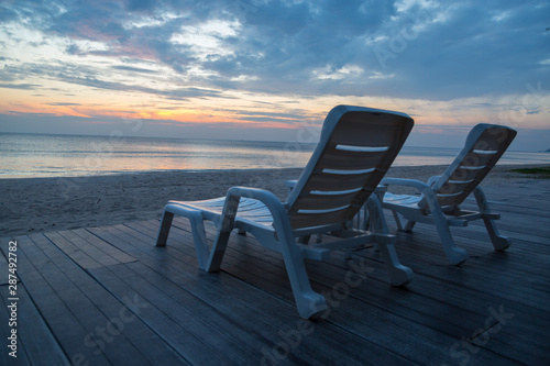 White chairs on the beach before sunset background