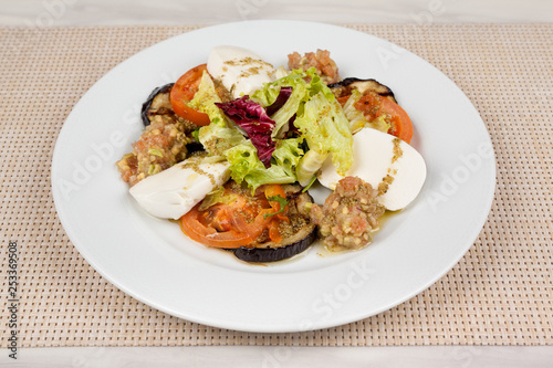 White cheese salad with tomato, eggplant and cabbage on a plate.
