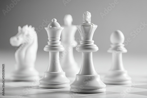 White chess pieces on a chessboard, with black and white colors, a blurred background, and high-resolution photography in a stock photo style