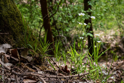 forest, flower, white, nature, green, chickweed, plant, grass, spring, leaf, growth, tree, ground, summer, outdoors, natural, moss, fresh, environment, closeup