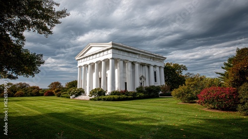 building, column, structure, architecture, lawn, tree, shrub, garden, white, exterior, classical, house, luxury home, temple, historical, light, cloudy, day, outdoors, landscape, design, photo, image, background, summer, autumn, nature, photographic, real, stock, vintage, high, quality, detail, classic, historic, detailed