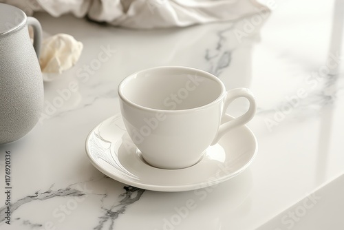 White Coffee Cup and Saucer on a Marble Countertop with Soft Diffused Lighting and Empty Space on the Left Side for a Minimalist Aesthetic