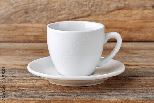 White Coffee Cup with Saucer on Wooden Table Surface in Natural Light Setting