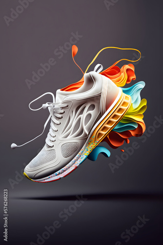 White colorful sports sneakers with flying shoe abstract painting shapes white pastel background