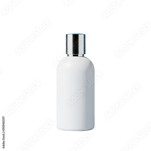 White cosmetic bottle with silver cap isolated on transparent background