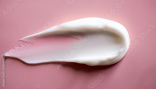White cosmetic cream smear on pastel pink surface. Creamy texture. Skin care, beauty product