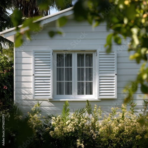 bungalow, white, window, shutter, greenery, garden, house, exterior, architecture, building, facades, design, structure, residential, home, view, daylight, nature, plant, leaf, branch, sunlight, shadow, detail, texture, surface, material, construction, frame, roof, wall, trim, lattice, panel, horizontal, vertical, line, shape, composition, balance, harmony, peaceful, quiet, calm, serene, inviting, charming