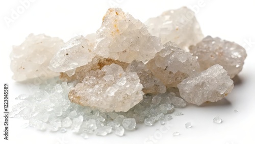 crystal, crystalline, white, substance, texture, granular, mineral, geology, science, nature, pile, heap, rock, rough, opaque, semitransparent, solid, macro, closeup, detail, background, white background, studio shot, isolated, small, piece, fragment, formation, structure, natural, earth, chemistry, research, sample, material, aggregate, light, shadow, contrast