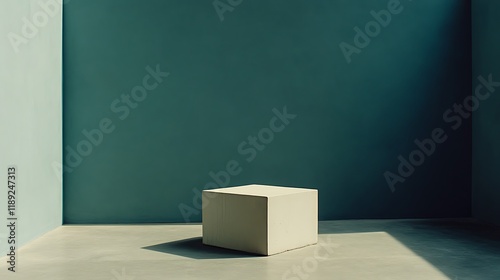 cube, white, room, interior, design, minimalist, simple, clean, modern, background, studio, space, empty, blank, light, shadow, corner, wall, floor, teal, green, grey, beige, neutral, texture, surface, geometric, shape, abstract, art, photo, image, picture, display, platform, product, object, presentation, scene, atmosphere, mood, calm, serene, quiet