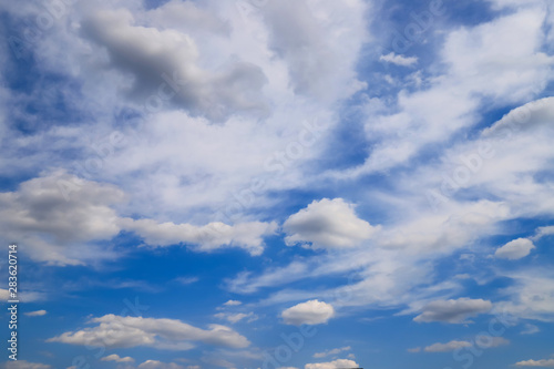 White cumulus clouds against the blue sky, rain clouds. Picturesque landscape background, weather, climate