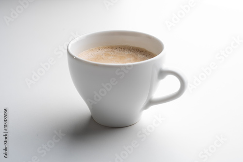 White cup of coffee in soft light isolated on a white background. Cappuccino coffee.