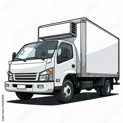 truck, vehicle, white, transportation, delivery, commercial, cargo, box, van, freight, commercial vehicle, delivery truck, transport, logistic, road, street, highway, driving, journey, travel, shipping, wheel, tire, chassis, cab, windscreen, headlamp, mirror, engine, metal, grey, black, modern, daytime, clean, glossy, isolated, background, studio, blank