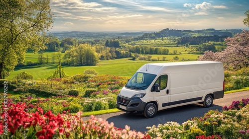 white, delivery, van, scenic, country, road, surrounded, countryside, flower, field, landscape, nature, travel, transportation, vehicle, rural, spring, green, hill, sky, blue, outdoors, vibrant, colourful, journey, drive, peaceful, serene, beauty, environment