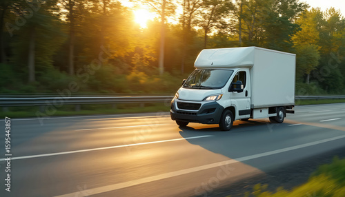 White delivery van travels fast on highway at sunset. Small cargo truck moves along road towards city. Logistics vehicle provides express shipment service for business and consumer packages.