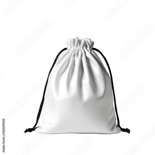 White drawstring bag with black cords on white background