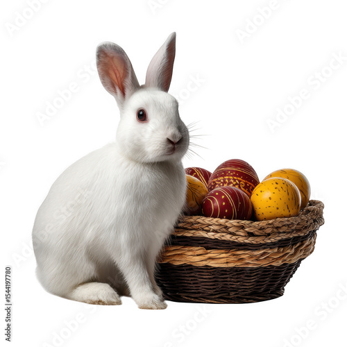 White easter bunny with decorated eggs basket isolated on transparent background