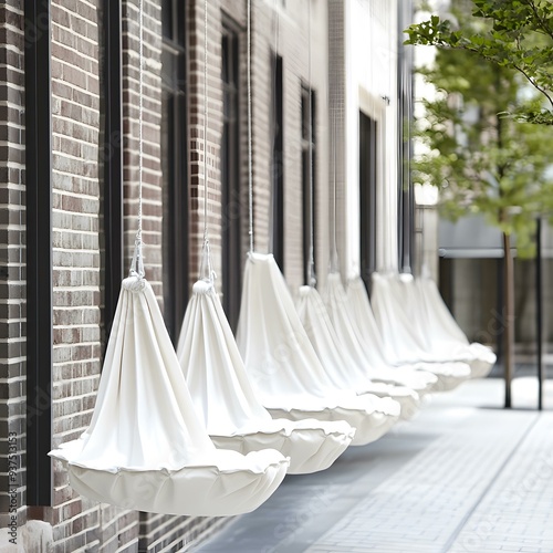 chair, fabric, white, hanging, row, brick, wall, design, modern, minimal, furniture, decor, style, architecture, building, space, interior, relax, comfort, lounge, suspended, swing, contemporary, aesthetic, art, installation, evironment