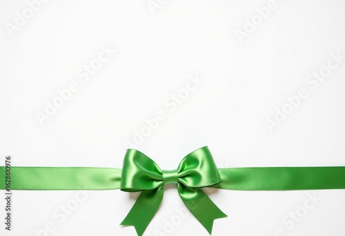 White festive background with green satin bow and ribbon, gift card template