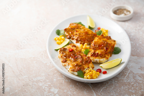 White fish fillet with pepper paste and corn