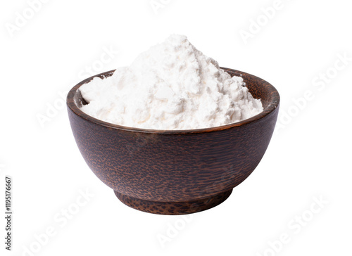 White flour (powder) in wooden bowl isolated transparent background.