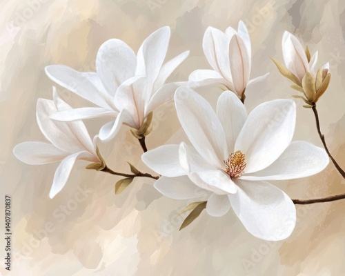 White Flower Drawing. Abstract Blossom on Tree Branch for Floral Banner Background
