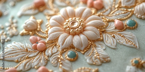 flower, gold, turquoise, design, elegant, luxury, aesthetic, decoration, white, floral, craft, craftsmanship, art, detail, ornate, jewellery, embellishment, pattern, style, beauty, hand-made, delicate, intricate, texture, background, closeup, macro, pastel, romance, vintage, baroque, rococo