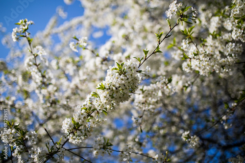 White flowers of the cherry blossoms on a spring day in the garden.
