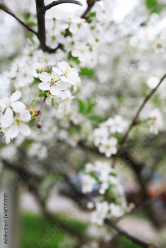 White flowers on a green bush. Spring cherry apple blossom. The white rose is blooming.
